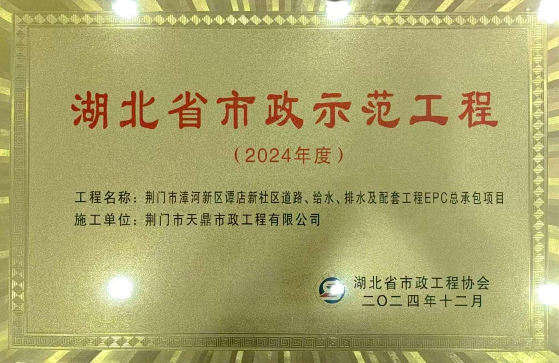 龍年將盡,再添佳績。近日,湖北省市政工程協會公示了2024年度“湖北省市政示范工程”評價結果,由漳富集團投資、天鼎市政公司承建的荊門市漳河新區譚店新社區道路、給水、排水及配套工程EPC總承包項目榮獲2024年度“湖北省市政項目示范工程”稱號。該項目位于荊門市漳河新區譚店社區以東,鳳袁路以南,施工內容包括道路、交